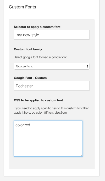 Using the example below any element given the class .my-new-style will render using the Rochester font and the color red.
