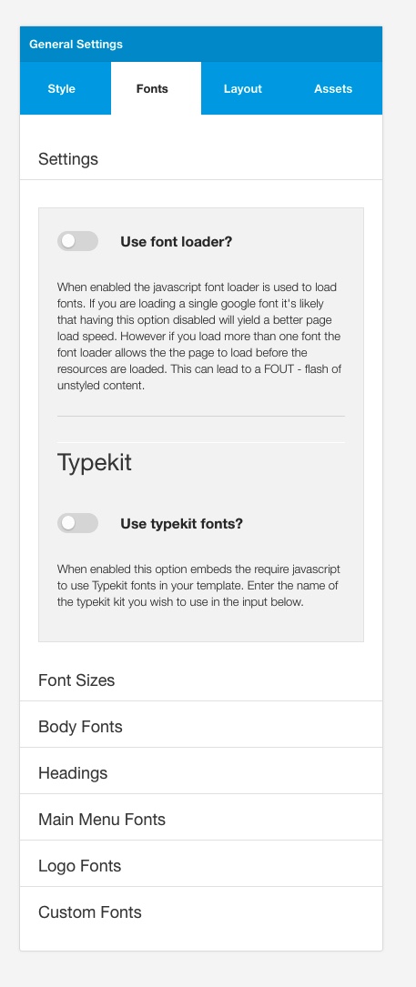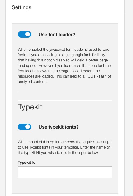 A new feature to zgf5 themes is the ability to specify whether or not to use the javascript loader to load fonts. The javascript loader ensures that the site loads faster as the font assets are loaded after the site loads. Using the font loader however can cause what is known as a FOUT or Flash of unstyled content where there is a slight flash on the page as the new font is applied to your content.